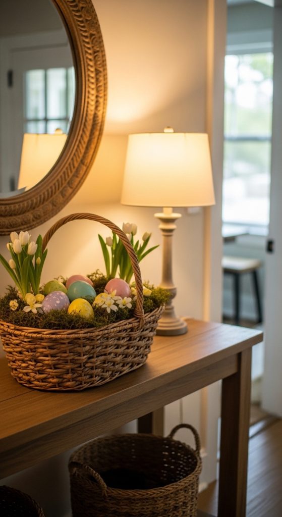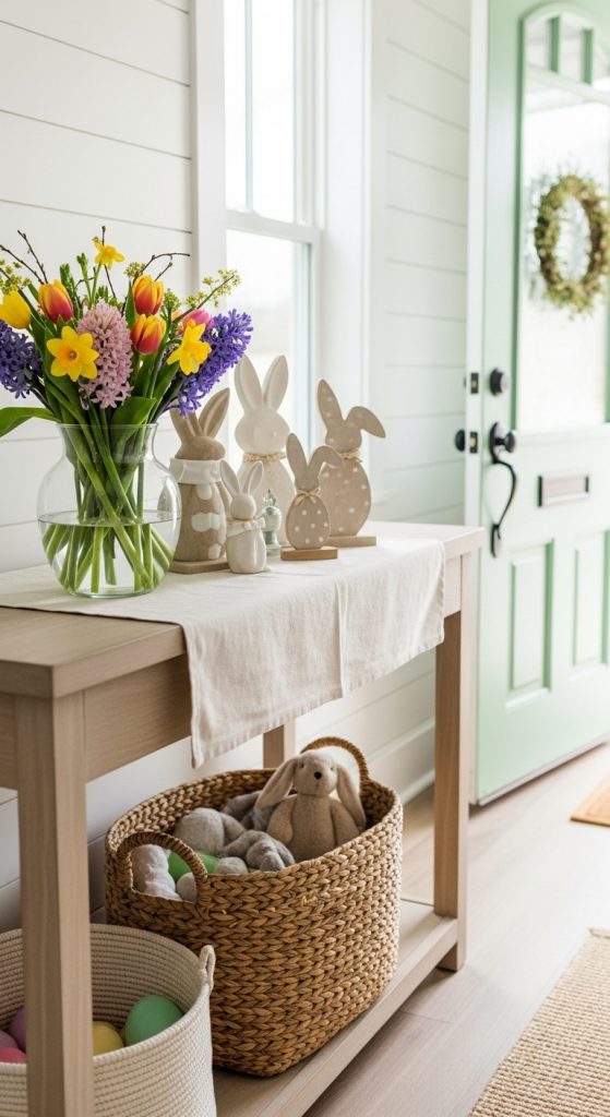 Place a small console table near the entrance and decorate it with a linen runner, a vase of spring flowers, and a few neutral bunny accents. Add a woven basket filled with blankets or decorative eggs underneath the table.