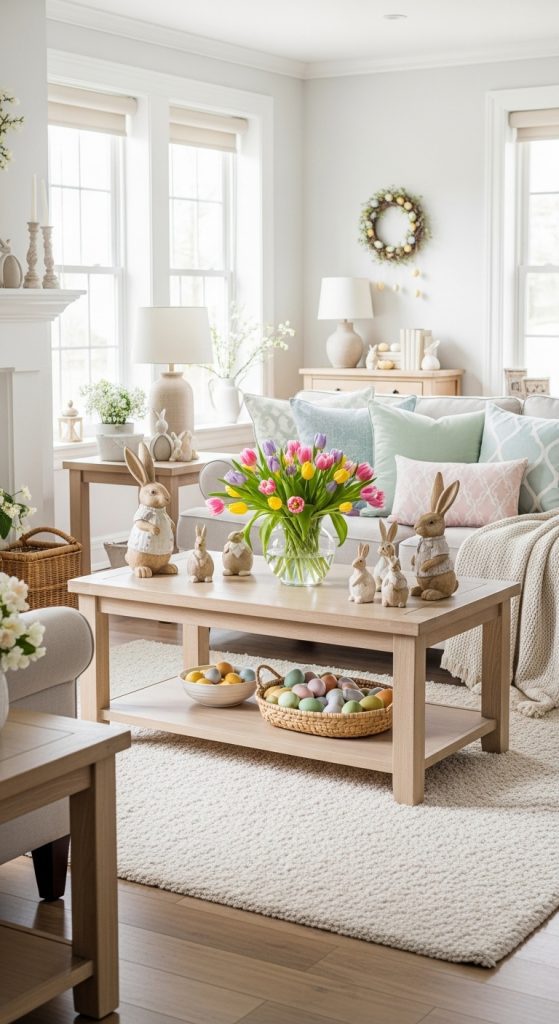 Instead of brightly colored decorations, modern cottage style leans toward soft neutral tones. Decorative bunny figurines in white, beige, or light wood create a subtle Easter theme while keeping the space elegant.
