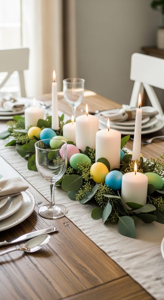 Use a wooden tray or dough bowl as the base. Fill it with pastel eggs, moss, small nests, and candles. Add a few sprigs of eucalyptus or fresh tulips for a soft spring touch. This combination creates a centerpiece that feels organic, relaxed, and stylish.