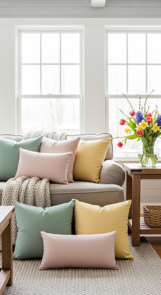Switching out your throw pillows is one of the easiest ways to update your home for the season. Choose pastel-colored pillows in shades like sage green, dusty blue, blush pink, or soft yellow.