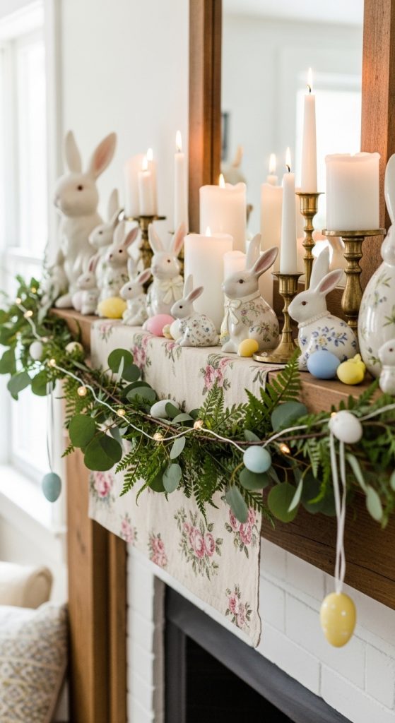 Layer in ceramic rabbits, white candles, and small glass jars filled with pastel eggs. You can also add a rustic wooden sign or framed spring artwork. The goal is to create a balanced display that feels curated rather than crowded.
