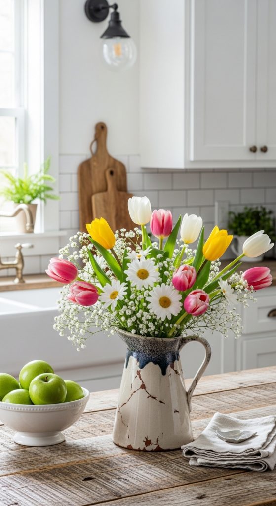Flowers are essential for modern cottage Easter decor. Choose soft, romantic blooms such as tulips, daisies, ranunculus, or baby’s breath.