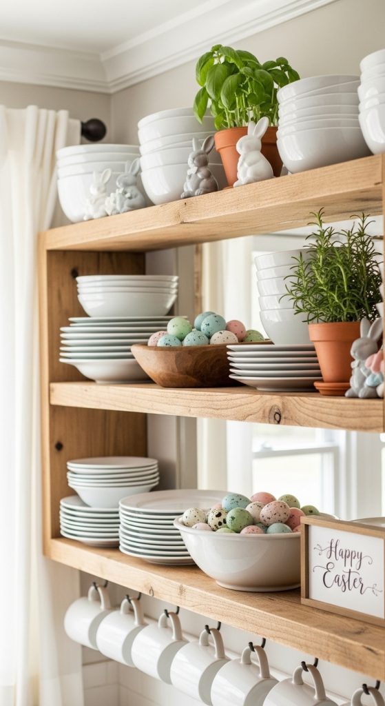 Combine stacked dishes, wooden cutting boards, small potted plants, and a few Easter-themed accents like tiny bunny figurines or speckled eggs in bowls. Keeping the color palette neutral ensures the display looks modern rather than overly festive.