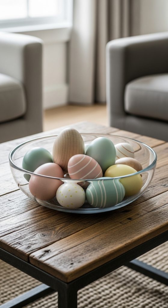 Decorative eggs are a classic Easter symbol, but they can be styled in a more modern way. Instead of brightly colored plastic eggs, choose wooden, ceramic, or neutral-toned eggs.