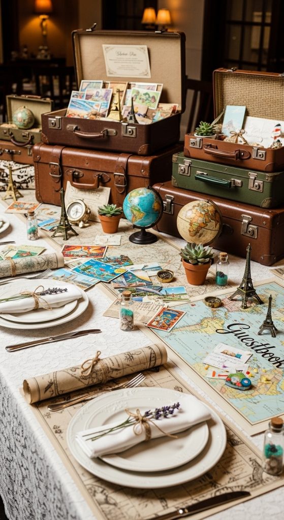 If the bride loves traveling, a travel-themed shower is a creative choice. Use maps, postcards, and vintage suitcases as decor.