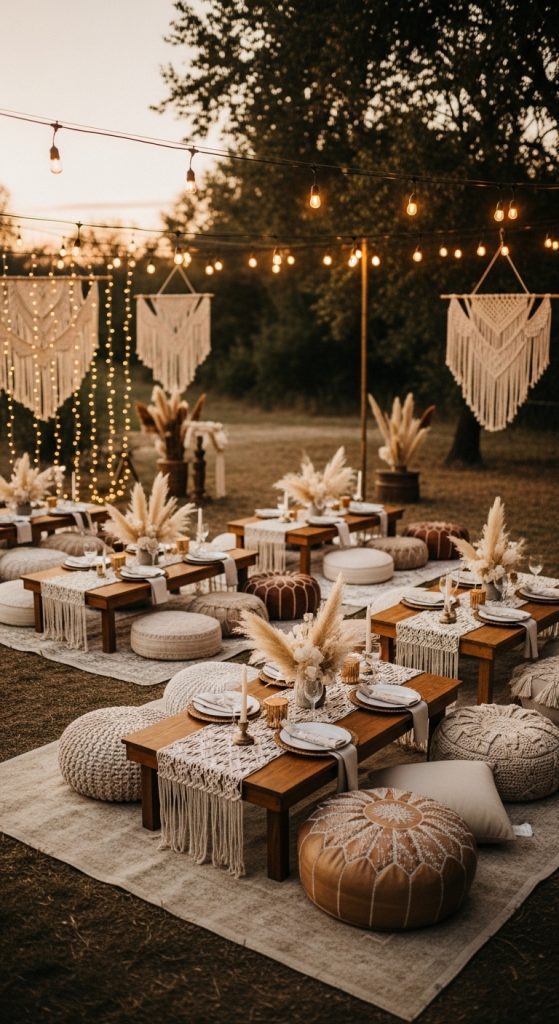 Boho themes are incredibly popular and surprisingly affordable to execute. Focus on natural textures like jute, wood, and macramé. Lay down rugs and floor cushions instead of renting chairs.
