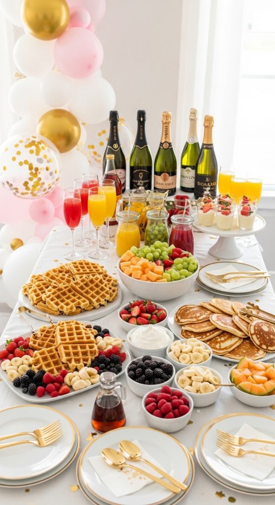 Serve affordable brunch items like pancakes, mini waffles, muffins, and fruit platters. Use balloons, simple banners, and gold accents for decor. Brunch themes are naturally relaxed and don’t require heavy decorations.