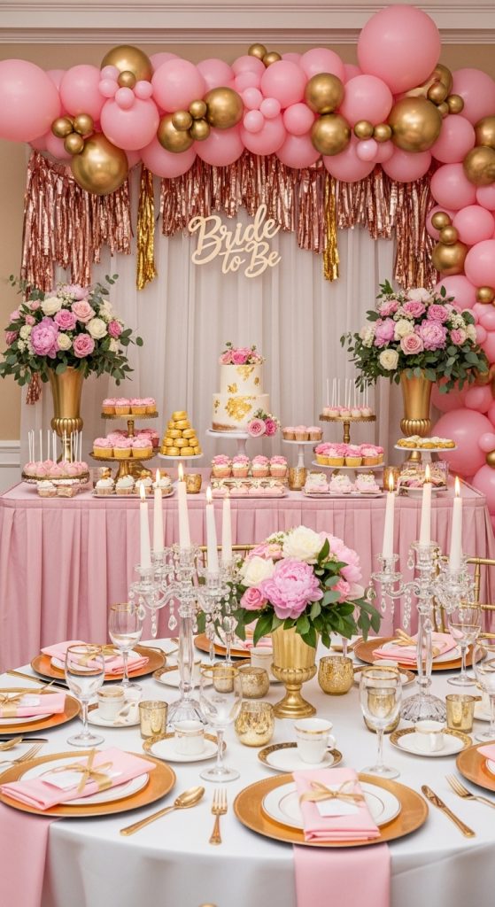 If the bride loves a touch of glamour, a pink and gold theme can look luxurious on a budget. Use pink tableware, gold foil balloons, and metallic streamers.