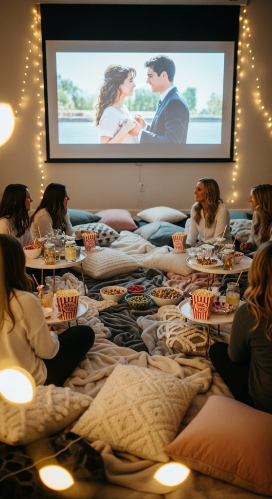 For a unique and cozy idea, host a movie night featuring the bride’s favorite romantic films. Set up a projector, use blankets and pillows for seating, and create a relaxed atmosphere.