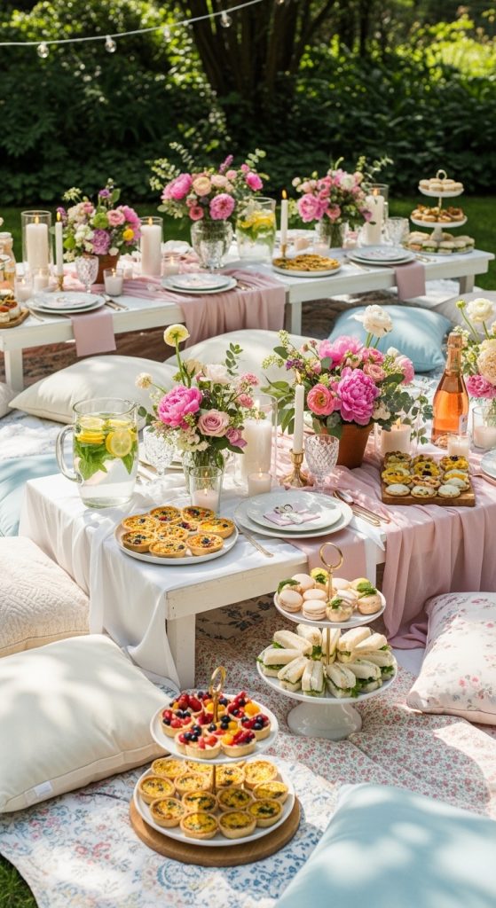 A picnic-style bridal shower is both trendy and budget-conscious. Use low picnic tables or blankets on the ground with cushions for seating.