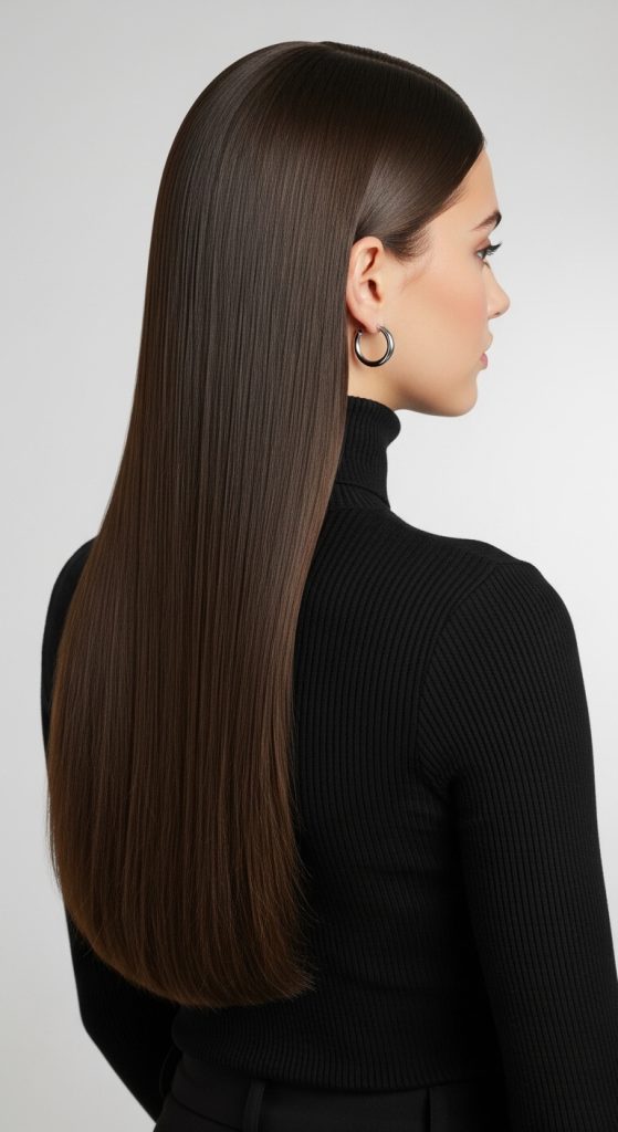 Use a flat iron and a smoothing serum to achieve a glossy, frizz-free finish.