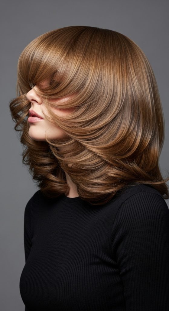 This style works best with layers and gives your hair a full, healthy appearance. Use a round brush and volumizing products for the best results.