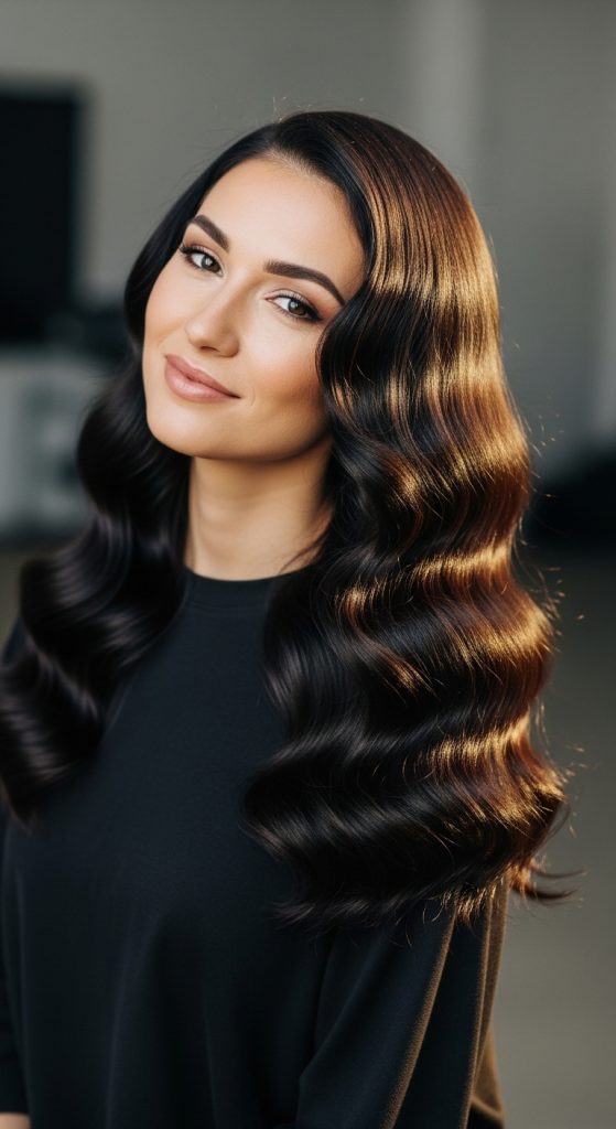 Side-swept mermaid waves offer a glamorous, old-Hollywood touch. This style involves sweeping all your hair to one side and creating deep, flowing waves that cascade over your shoulder. It’s perfect for formal events, evening parties, or photo shoots. To enhance this look, use a smoothing serum to tame frizz and a large curling wand to achieve the voluminous, silky waves that define this hairstyle.
