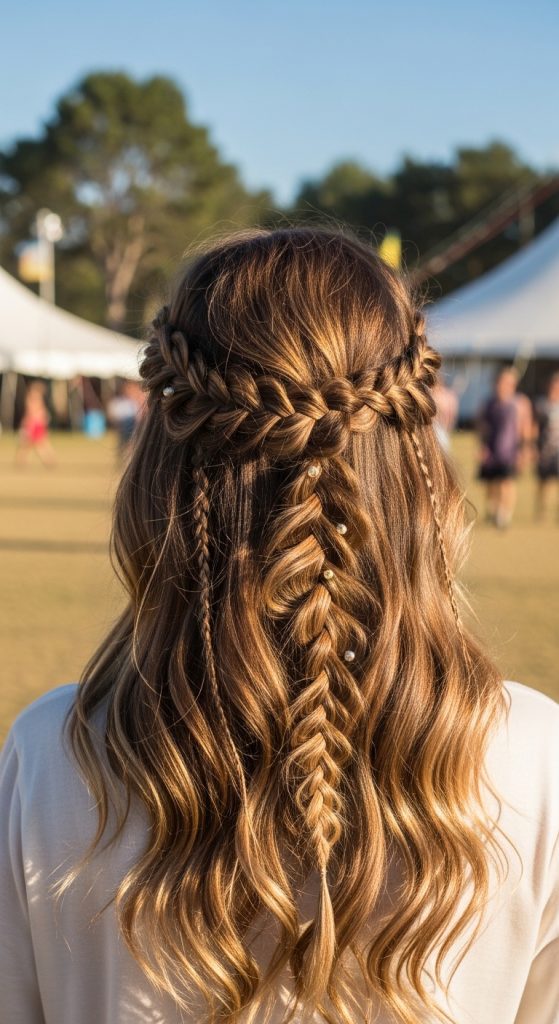Braids add a whimsical and intricate touch to mermaid waves. There are multiple ways to incorporate braids, from a small accent braid along the side to a loose crown braid that blends into the waves. This style is perfect for boho weddings, beach outings, or festival looks. The braid enhances the mermaid vibe by adding texture and visual interest, giving your waves a unique, playful dimension.