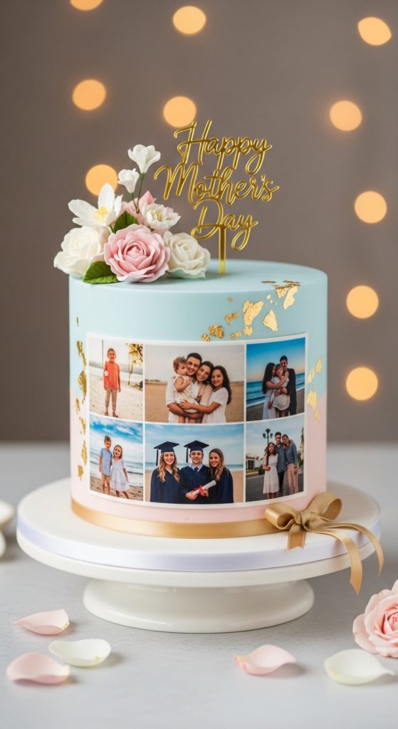 For a sentimental touch, a personalized photo cake is a wonderful idea. You can print edible images of family memories or a favorite moment with your mom on a thin sugar sheet and place it atop a smooth fondant or buttercream base. This cake becomes a keepsake, evoking warm memories with every bite. It’s perfect for moms who treasure personalized and meaningful gestures.