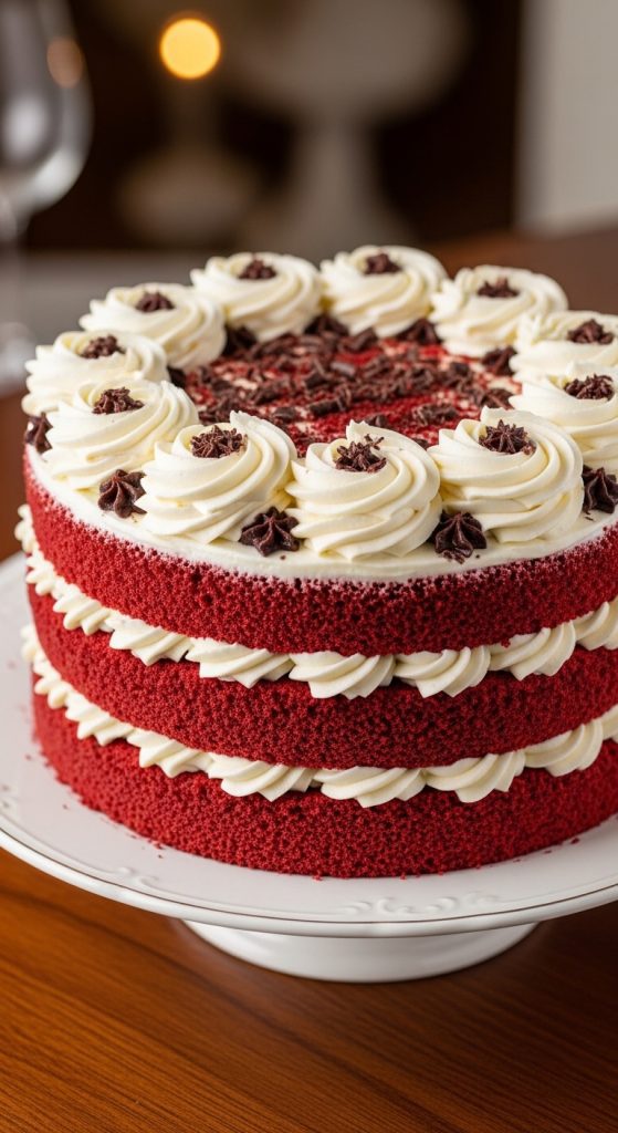 Red velvet cake is a classic that combines visual appeal with a luscious taste. The deep red sponge contrasts beautifully with white cream cheese frosting. Adding a decorative border of piped rosettes or chocolate shavings can enhance the cake’s elegance. This cake is perfect for moms who appreciate tradition with a touch of luxury.
