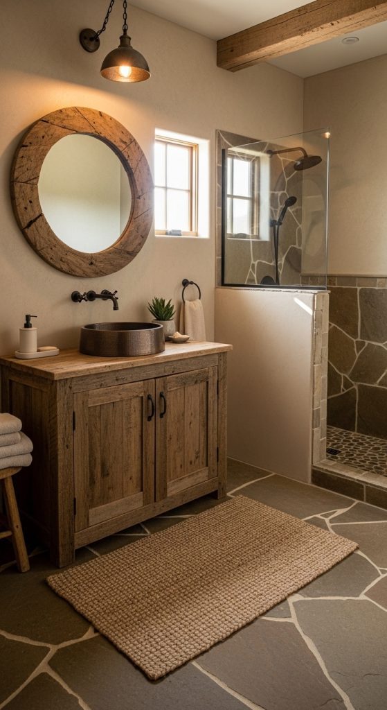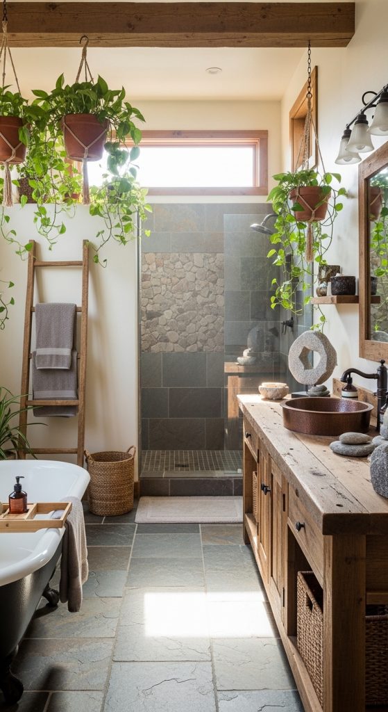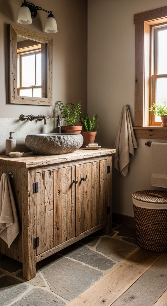 Bring the outdoors inside with nature-inspired décor. Add potted plants, dried flowers, or even small branches in vases. Wooden trays, stone soap dispensers, and ceramic containers can further enhance the rustic vibe. These finishing touches help create a serene and harmonious environment.