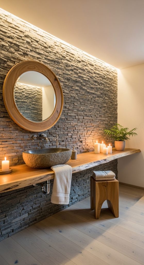 Stone walls bring a rugged and earthy vibe to the bathroom. Whether you choose full stone cladding or a single accent wall, it adds depth and texture to the space. Natural stones like slate, river rock, or limestone work beautifully in rustic settings. Combine this feature with soft lighting to create a spa-like ambiance.