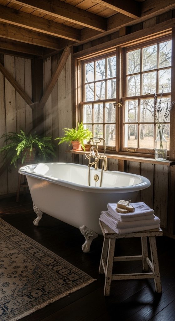 A clawfoot or freestanding bathtub is a staple in rustic bathroom design. Its vintage look complements rustic décor while adding a touch of elegance. Opt for neutral colors like white, cream, or matte black to keep the design grounded. Positioning the tub near a window can enhance the relaxing atmosphere.