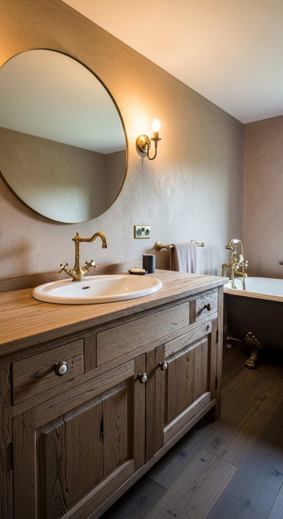 Swap out modern fixtures for vintage-style faucets, handles, and showerheads. Oil-rubbed bronze, brushed nickel, or antique brass finishes work particularly well in rustic bathrooms. These small details can make a big impact and tie the entire look together.