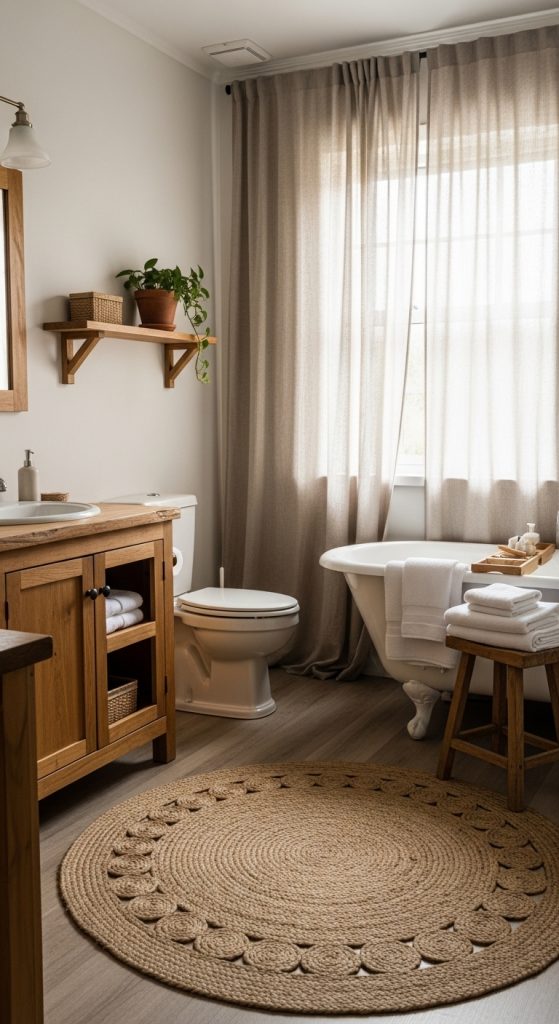 Incorporate natural materials like cotton, linen, and jute for towels, rugs, and shower curtains. These textiles add softness and warmth while maintaining the rustic aesthetic. A woven jute rug or a linen shower curtain can subtly elevate the overall design.