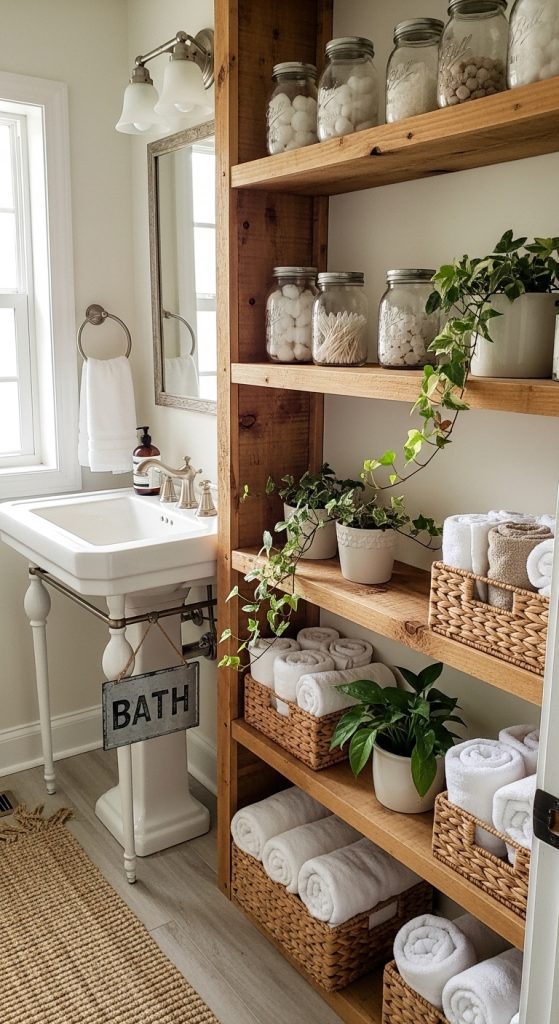 Open wooden shelves provide both storage and decorative opportunities. Display items like rolled towels, mason jars, candles, and small plants. Using handmade or vintage accessories enhances the authenticity of the rustic theme and makes the space feel lived-in and inviting.