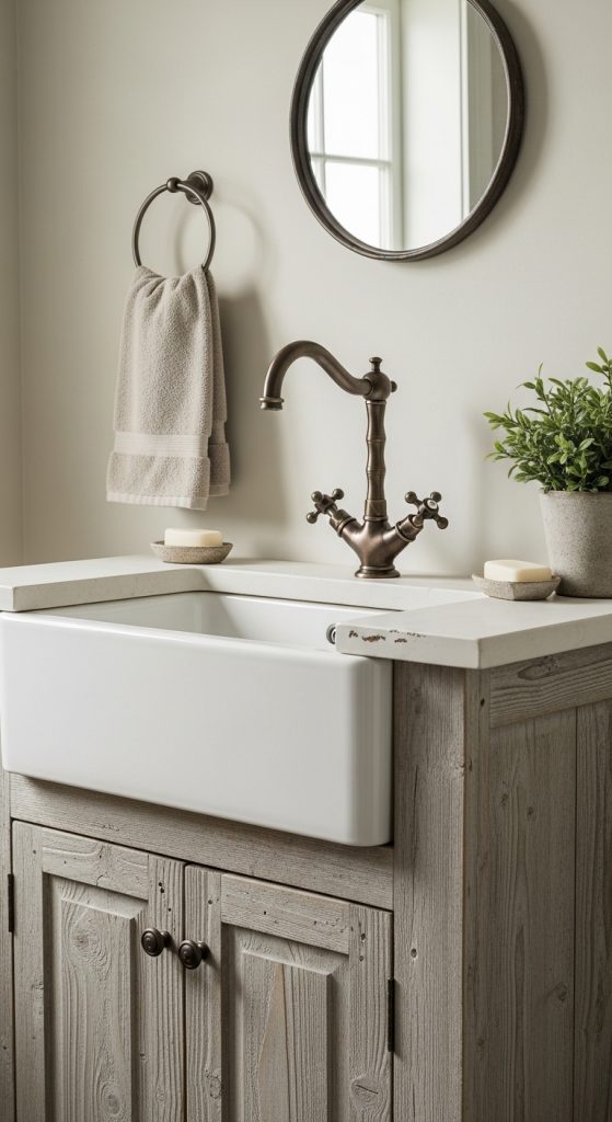 A farmhouse or apron-front sink is a classic rustic element. Its deep basin and simple design make it both functional and stylish. Pair it with a wooden vanity and vintage faucet to create a cohesive farmhouse-inspired look.