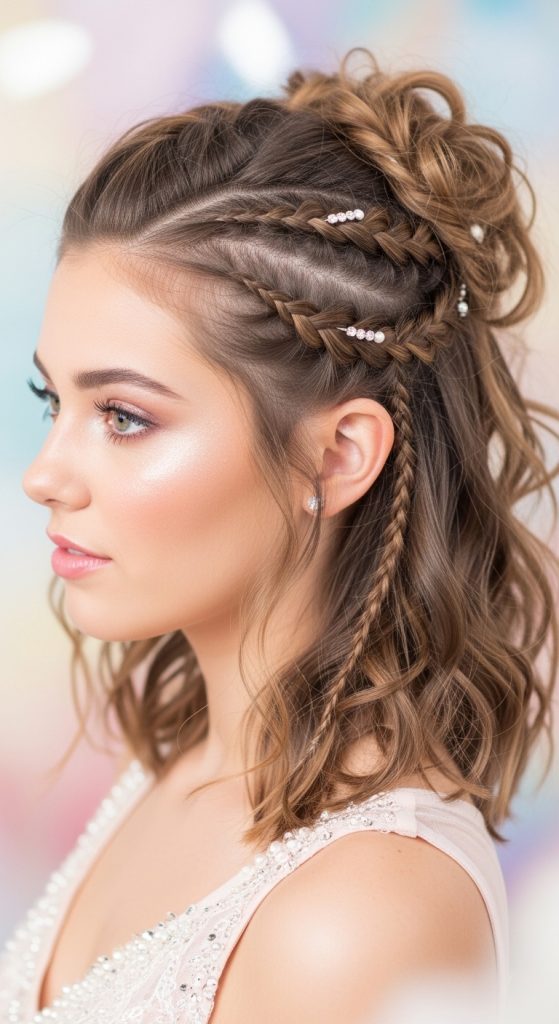 A braided half-up hairstyle is both playful and elegant. Small braids from both sides of the head are pulled back and secured together, while the rest of the hair flows naturally. This style adds texture and detail without overwhelming your overall look, making it perfect for medium hair.
