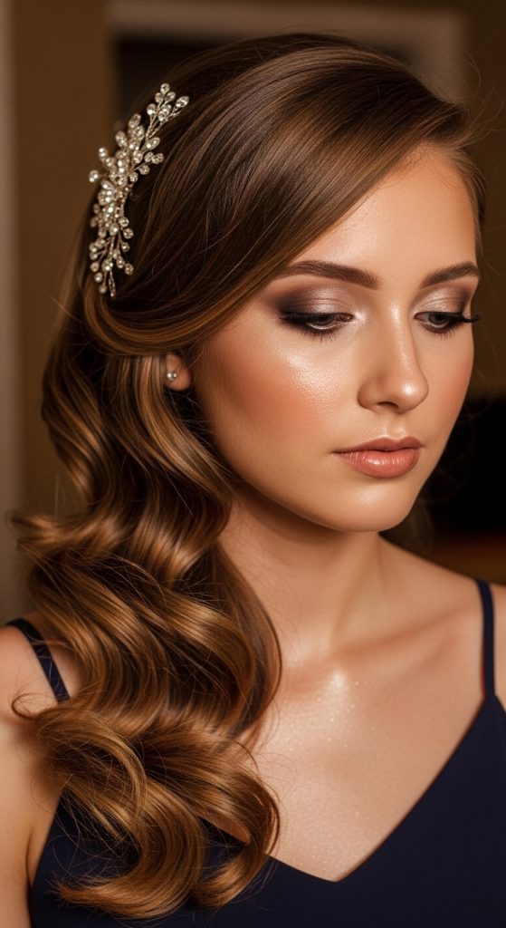 Loose curls styled with a deep side part create a romantic and dreamy prom look. Sweeping one side behind your ear and securing it with a decorative clip adds asymmetry and elegance. This hairstyle is simple yet incredibly eye-catching under prom lights.
