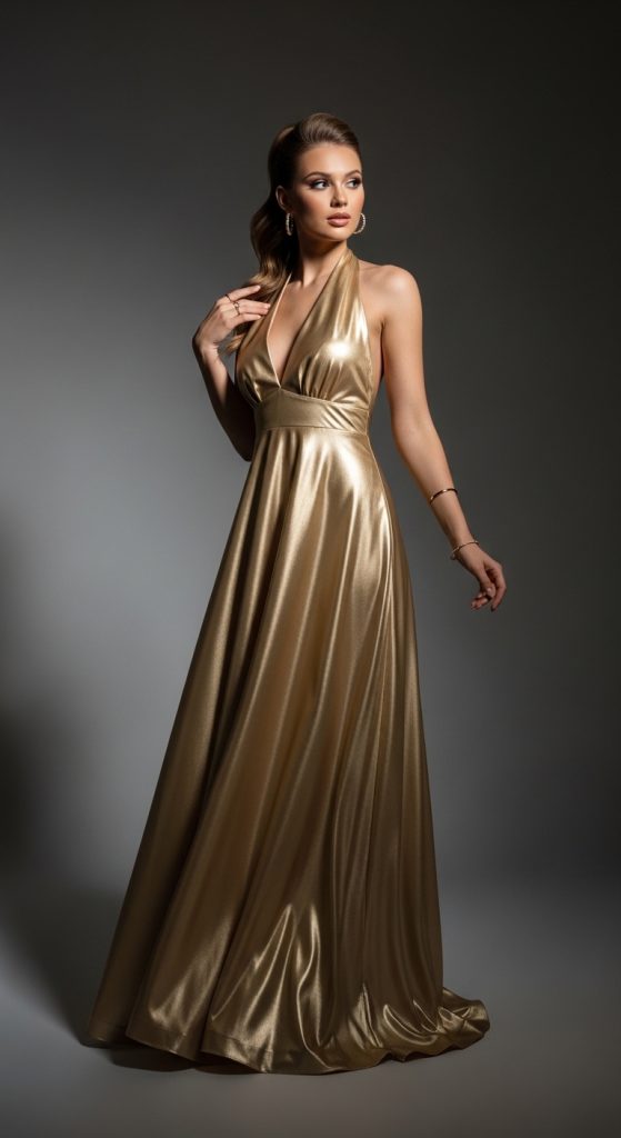 A halter neck silk dress offers a chic and modern vibe. This style draws attention to the shoulders and neckline, making it perfect for those who want a sleek yet stylish look. Metallic silk fabrics, such as gold or silver, can add a bold and fashion-forward touch.